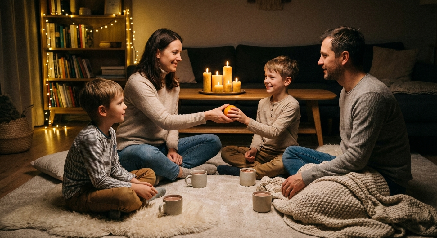 🧠 Психологічний секрет: У напівтемряві, тримаючи в руках щось тактильно приємне (апельсин, іграшку), людині легше розкритися. Ця гра знімає бар’єри. Ви здивуєтесь, наскільки глибокими можуть бути відповіді дітей, і як багато цікавого ви можете розповісти їм про себе.