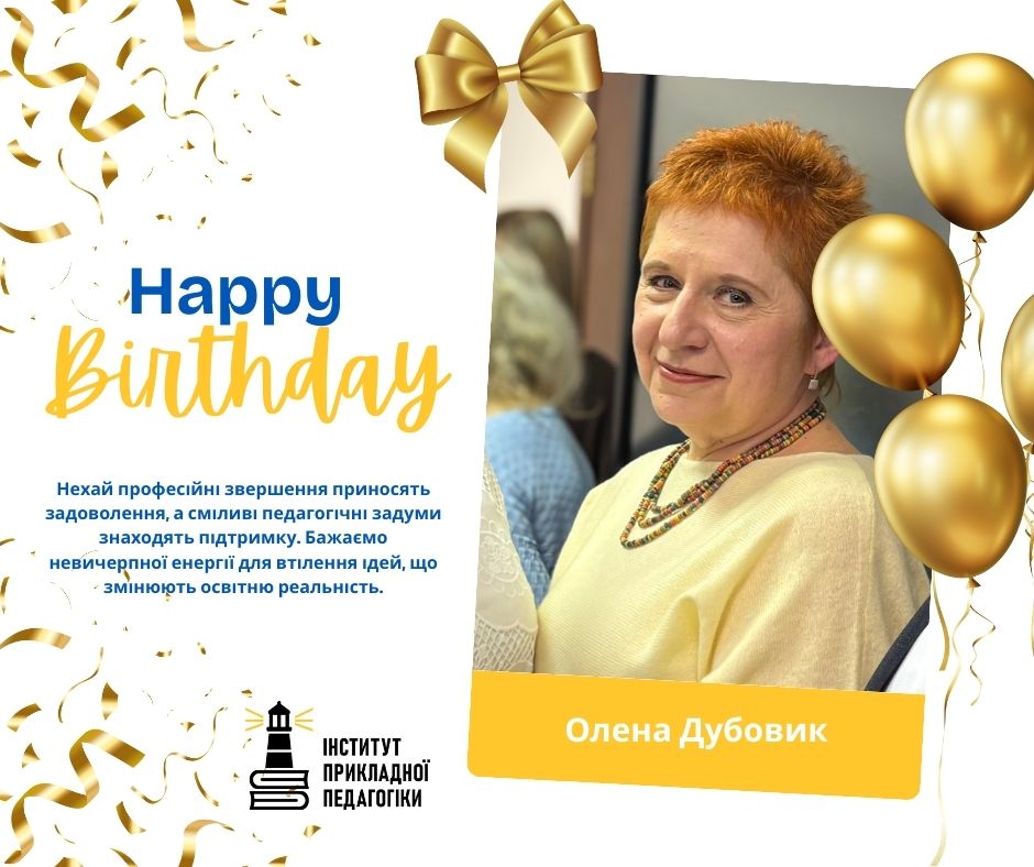 Колектив Інституту прикладної педагогіки щиро вітає Олену Анатоліївну Дубовик, заступницю директора та завідувачку відділу навчально-методичного забезпечення і змісту освіти, із днем народження.