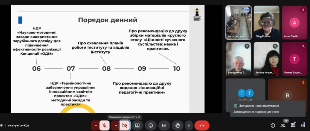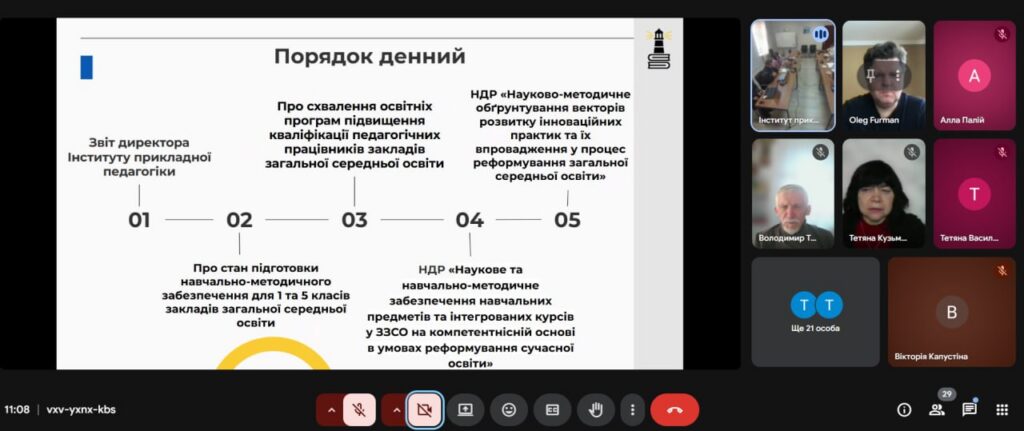 Під час засідання було розглянуто ключові напрями роботи ІПП у контексті сучасних освітніх змін. Зокрема, заслухано звіт директора Інституту, а також обговорено стан підготовки навчально-методичного забезпечення для 1 та 5 класів закладів загальної середньої освіти.